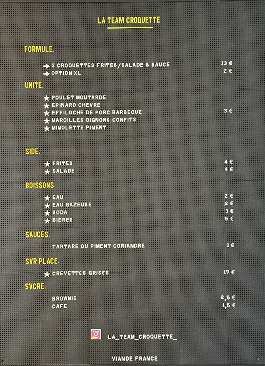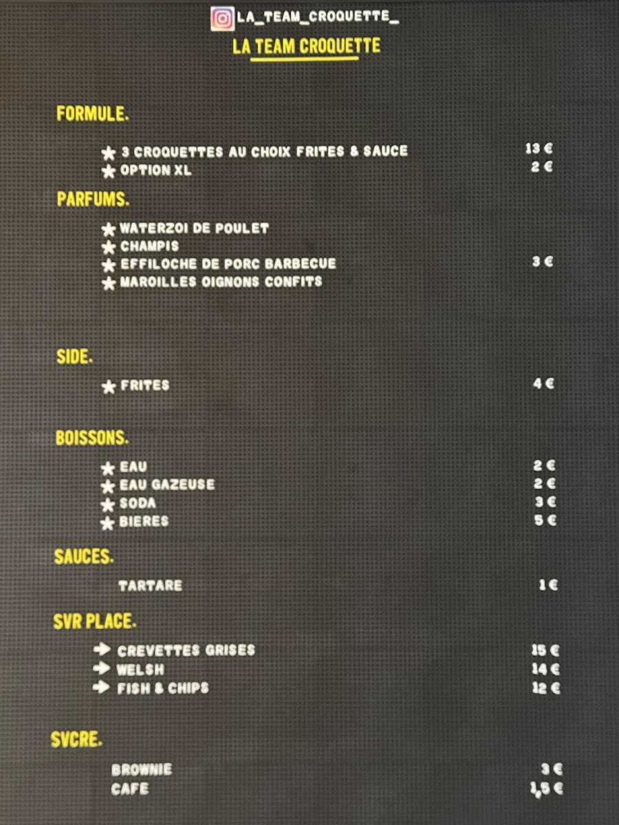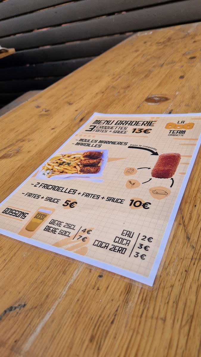 From a reviewer's perspective, the menu at La Team Croquette in Lille is a delightful celebration of crispy, flavorful croquettes that cater to a range of tastes. The Formule offers a convenient option with 3 croquettes of your choice, served with frites and/or salad, plus a homemade sauce, making it perfect for sampling multiple varieties. For those looking for something more indulgent on-site, the Welsh Croquette stands out as a hearty option. The savory croquettes selection is particularly tempting, featuring Croquettes effiloché de poulet, moutarde, Croquettes de maroilles, confits d'oignons, Croquettes de poisson, ail et fines herbes, Croquettes courges, Ricotta, and Croquettes raclette fumé, each combining bold flavors with satisfying textures. Side dishes like Frites Maison and Salade de saison complement the croquettes beautifully, balancing richness with freshness. Overall, the menu emphasizes both creativity and comfort, making La Team Croquette a must-visit for anyone seeking a playful yet flavorful dining experience in Lille.